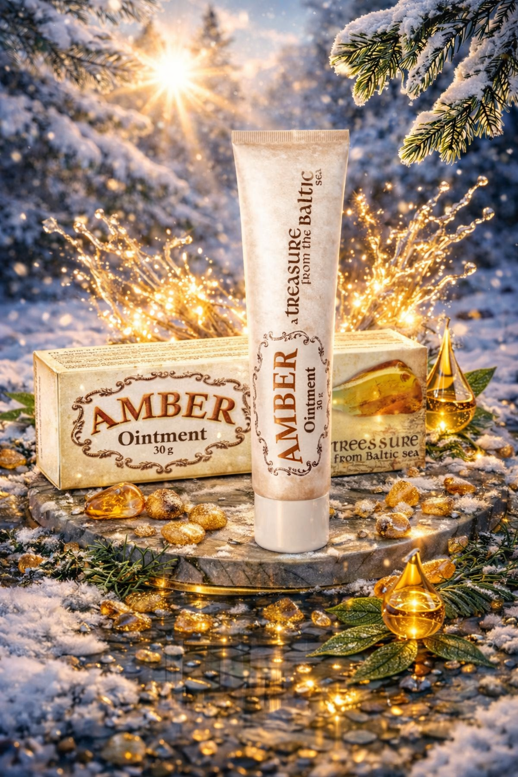 W opakowaniu znajduje się 30 g maści bursztynowej. W skład produktu wchodzi ekstrakt z bursztynu. Maść pozbawiona jest sztucznych barwników, substancji zapachowych, konserwantów oraz parabenów. Produkt należy aplikować równomiernie w okolicach sztywnego czy obolałego stawu 2–3 razy dziennie, delikatnie wmasowując, czy też wcierając go w skórę. Szczególnie zaleca się stosowanie produktu po wysiłku, gdyż wykazuje działanie relaksujące i odprężające, a dodatkowo redukuje uczucie zmęczenia.